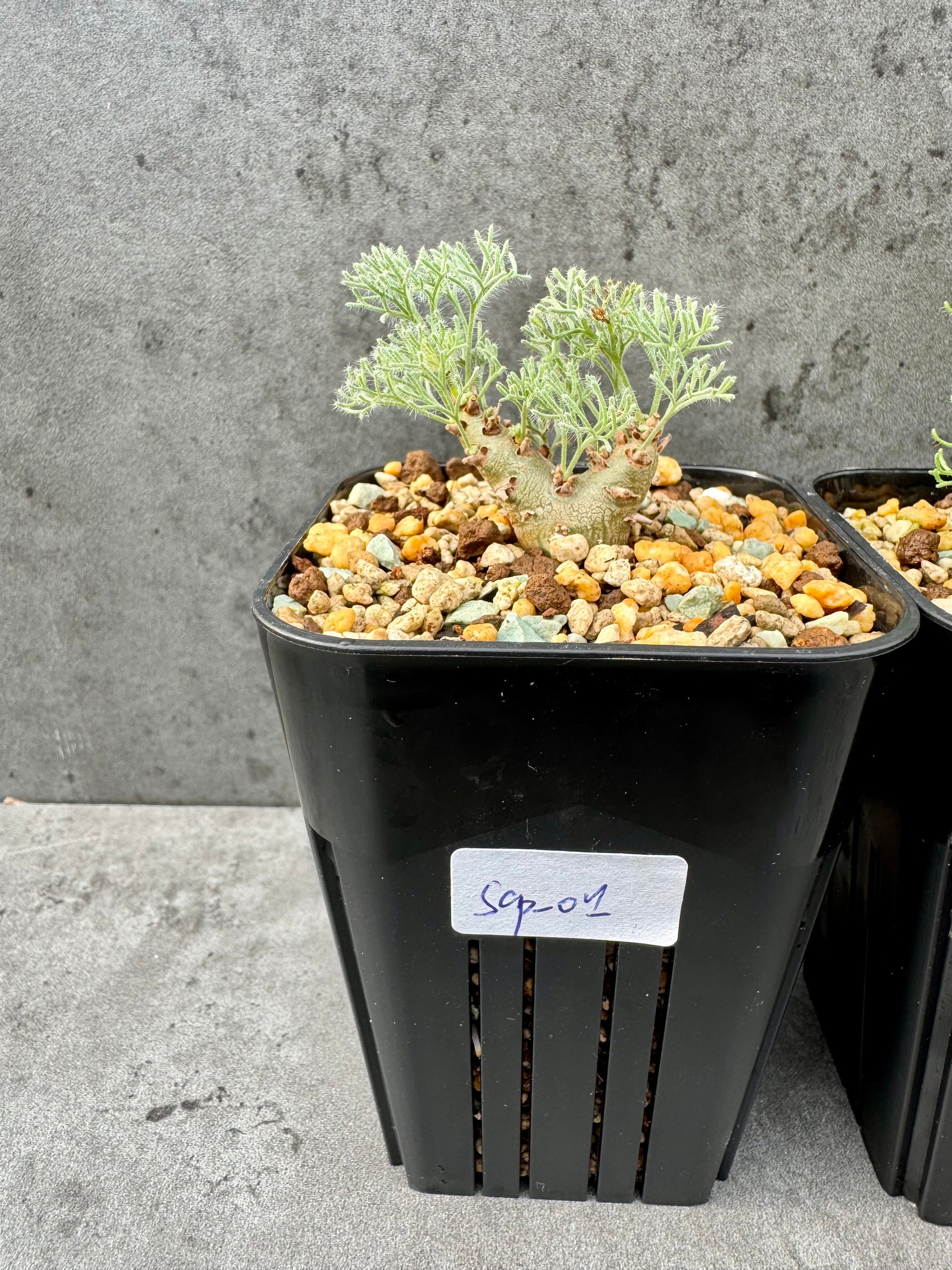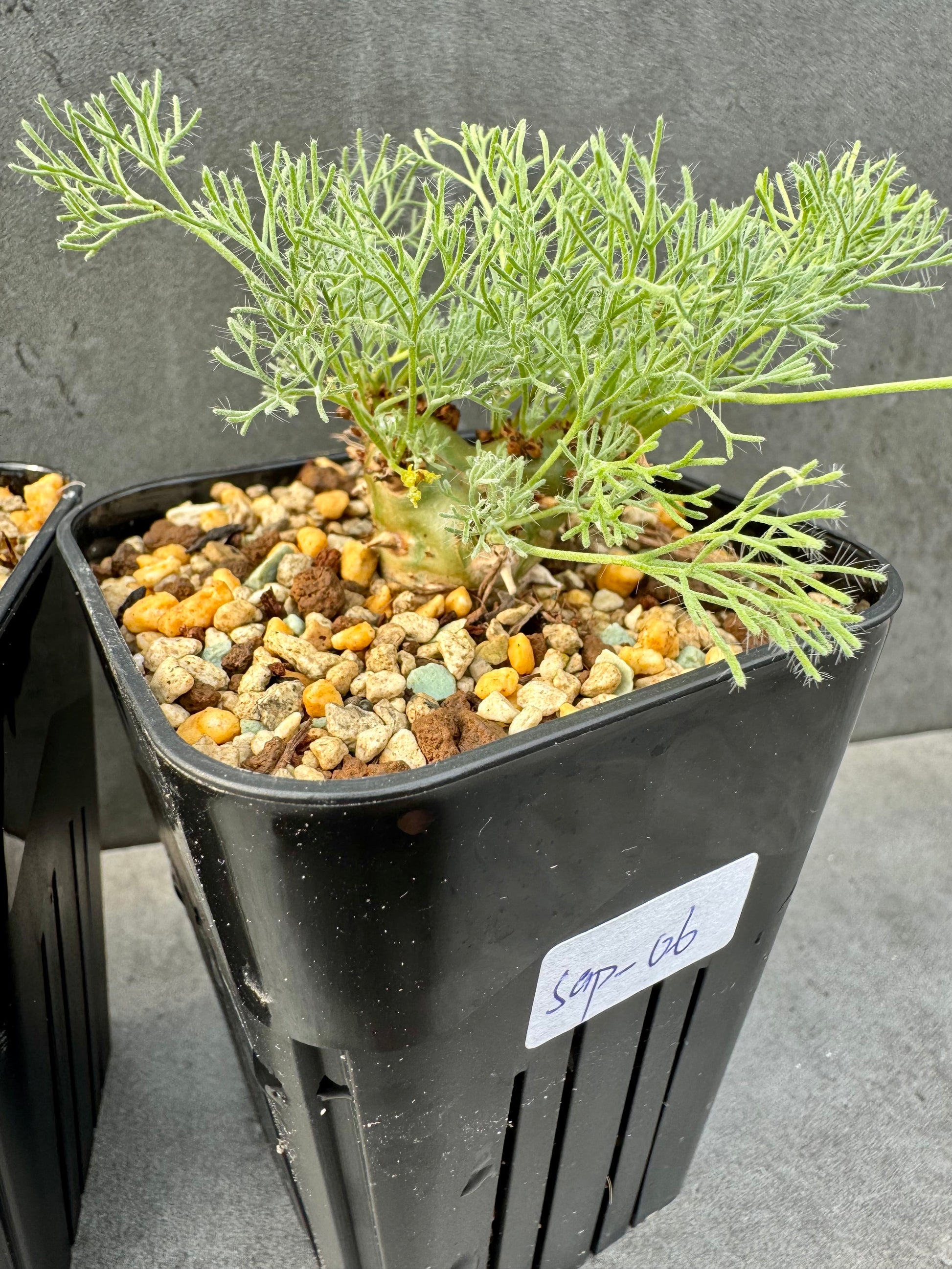 Sarcocaulon peniculinum – seltener, stark sukkulenter Zwergstrauch aus Namibia mit silbrig-grauen, knorrigen Trieben und zarten rosa Blüten. Liebt volle Sonne, extrem durchlässiges Substrat und trockene Ruhephasen. Eine faszinierende Rarität für Liebhaber außergewöhnlicher Sukkulenten.