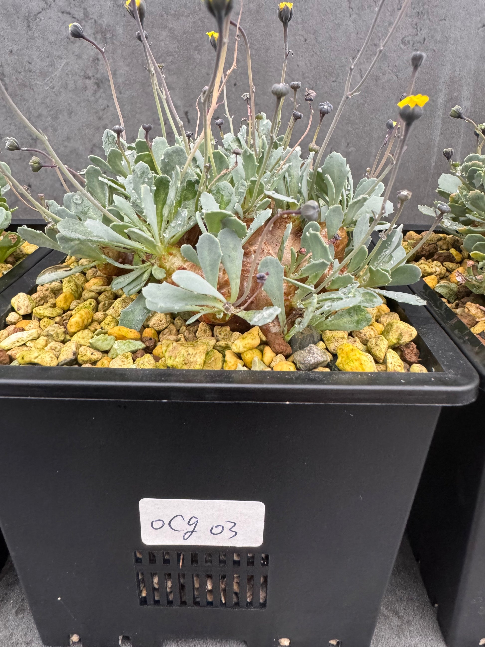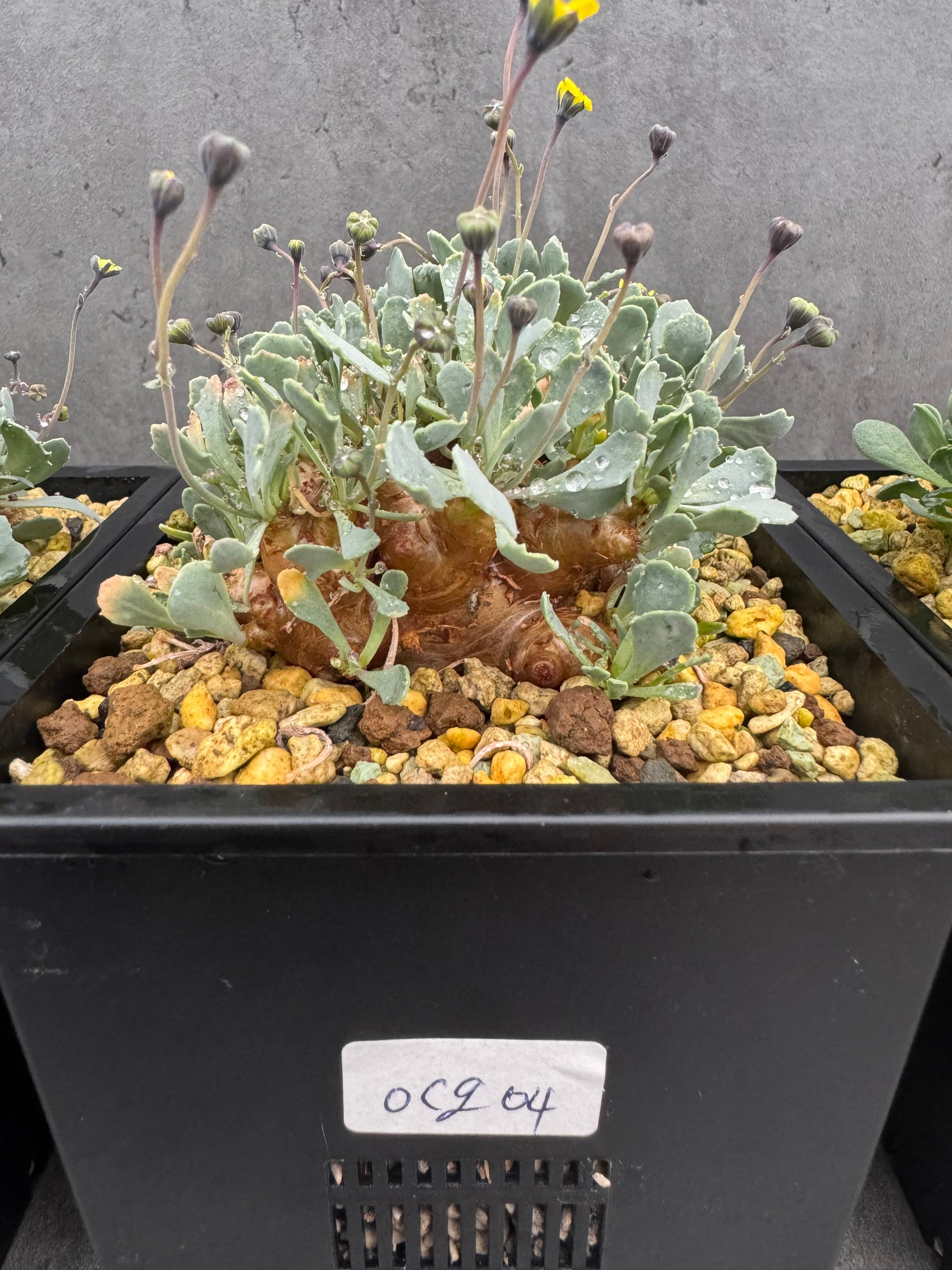 Mit ihrem flachen, oft rissig strukturierten Caudex erinnert sie optisch an Pachypodium brevicaule, gehört jedoch botanisch zur Familie der Korbblütler (Asteraceae). Ihre kompakte, gedrungene Form macht sie zu einem außergewöhnlichen Blickfang.